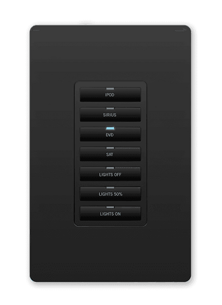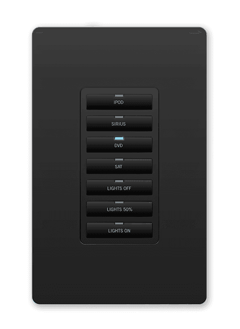 Teclado de control mural con 7 botones de doble ancho y conectividad Ethernet (10/100 Mbps). Alimentación a través de PoE (IEEE 802.3af, Clase 0). Permite la conexión en cadena de hasta tres unidades bajo una única dirección IP. Cada botón dispone de retroiluminación LED azul para feedback de estado. El botón inferior es configurable como una o dos acciones. Diseñado para montaje en caja de mecanismo universal y compatible con placas de pared de estilo Decora. Incluye un sensor IR de 38 kHz. Dimensiones: 103 x 45 x 25 mm.