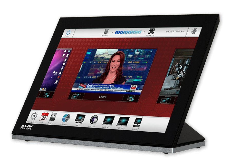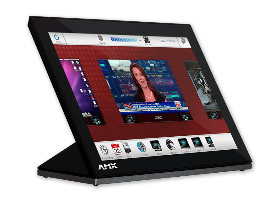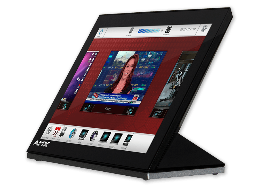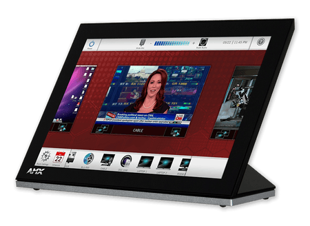Panel táctil de sobremesa de 10.1 pulgadas con pantalla capacitiva multi-táctil, tecnología IPS y resolución de 1280x800 píxeles. Incorpora un procesador de cuatro núcleos con motor gráfico AMX G5, 2 GB de memoria RAM y 16 GB de almacenamiento interno. La conectividad se realiza mediante un puerto Ethernet RJ-45 que también proporciona alimentación a través de PoE (IEEE 802.3af). Dispone de un puerto USB 2.0 para periféricos. Es capaz de decodificar vídeo en streaming (H.264, MPEG-2, MJPEG) e incluye un navegador web y visores de documentos integrados. Dimensiones: 157 x 255 x 103 mm. Peso: 1.18 kg.