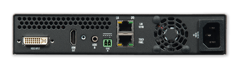 Accesorio de procesamiento y transmisión de vídeo para paneles táctiles diseñado para las series Modero X y Modero S. El dispositivo debe permitir la visualización de una transmisión de vídeo digital en alta definición (HD) en tiempo real o la generación de hasta 10 imágenes de vista previa en formato JPEG con actualización secuencial. Debe contar con una entrada de vídeo multiformato DVI-I compatible con señales digitales HDMI y analógicas (RGB, Componentes, Compuesto, S-Video) mediante adaptadores. El hardware debe incluir conectividad Ethernet 10/100 con puerto de paso (pass-through) para la conexión del panel táctil, salida de diagnóstico HDMI y entrada de audio analógico estéreo. Capacidad de integración nativa con conmutadores de presentación digitales. Alimentación 100-240 VAC. Dimensiones compactas para montaje en rack o superficie.