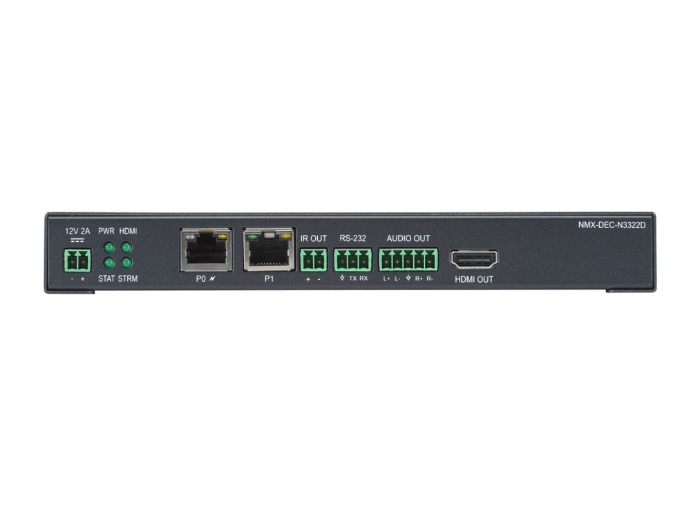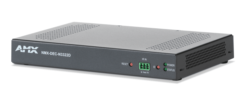 Diseñado para entornos corporativos, educativos y gubernamentales exigentes, el NMX-DEC-N3322D no solo decodifica señales de los codificadores de la serie AMX N3300, sino que también ofrece una interoperabilidad sin precedentes. Es compatible con cámaras, reproductores de señalización digital y software de terceros que utilicen el estándar Dante AV-H. Gracias a su capacidad para operar en redes de 1 Gbps con un ancho de banda optimizado, este dispositivo facilita la expansión de soluciones AV 4K60 a través de redes WAN y LAN existentes sin saturar la infraestructura.