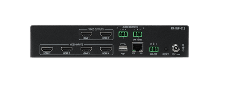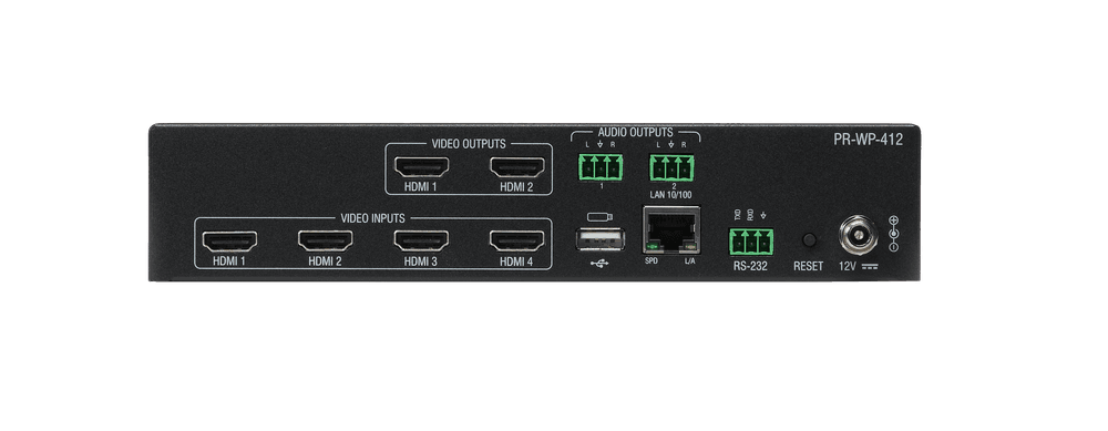 Por otro lado, al activar el modo de matriz de conmutación, el PR-WP-412 se transforma en un switcher 4x2 independiente. Aquí, el usuario puede enrutar cualquiera de las cuatro fuentes a cualquiera de las dos salidas de forma independiente. Lo que distingue a este equipo de la competencia es su capacidad de conmutación "seamless" en este modo: las transiciones entre fuentes son instantáneas, eliminando el molesto pantallazo negro o parpadeo que suele ocurrir al cambiar de video, garantizando una presentación fluida y profesional.