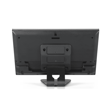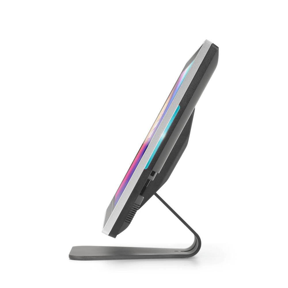 Soporte de sobremesa de grado profesional con inclinación seleccionable para paneles táctiles de 15.6 pulgadas. El dispositivo debe permitir la fijación mecánica del panel táctil en ángulos predeterminados de 30, 45 y 60 grados respecto a la vertical durante la instalación. Debe contar con un sistema de gestión de cables integrado que oculte las conexiones a través de la estructura del soporte. El diseño debe ser compatible específicamente con los modelos AMX VARIA-150 y VARIA-150N, asegurando estabilidad estructural y continuidad estética sin mecanismos de bisagra expuestos.