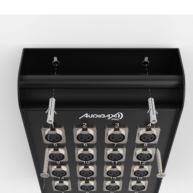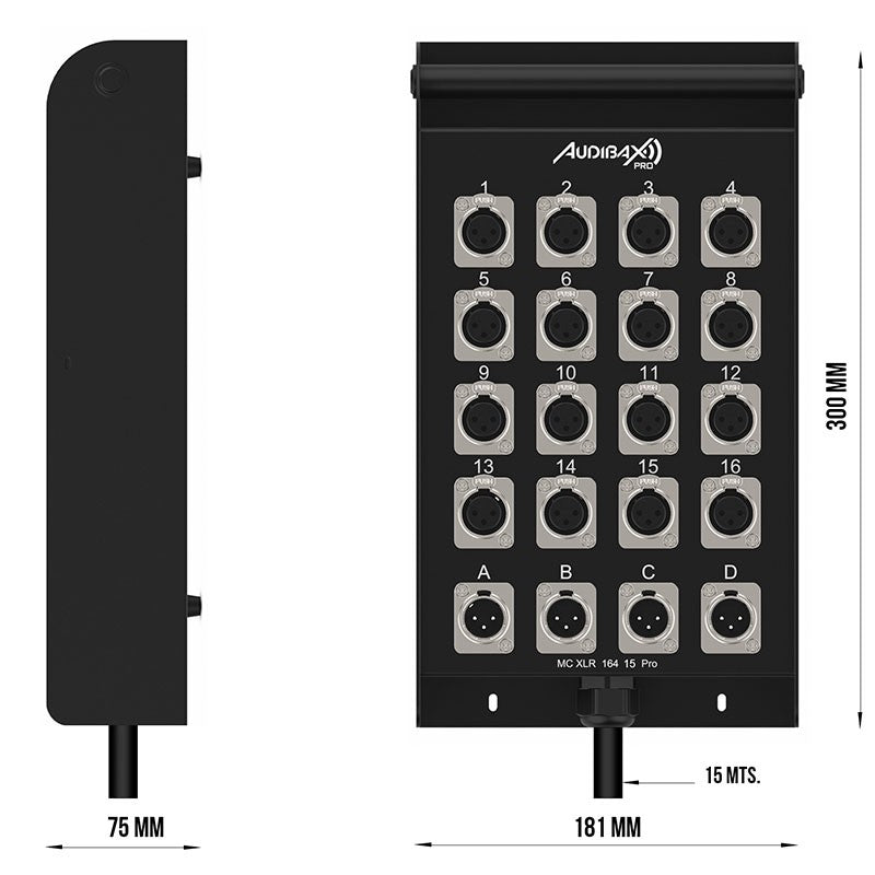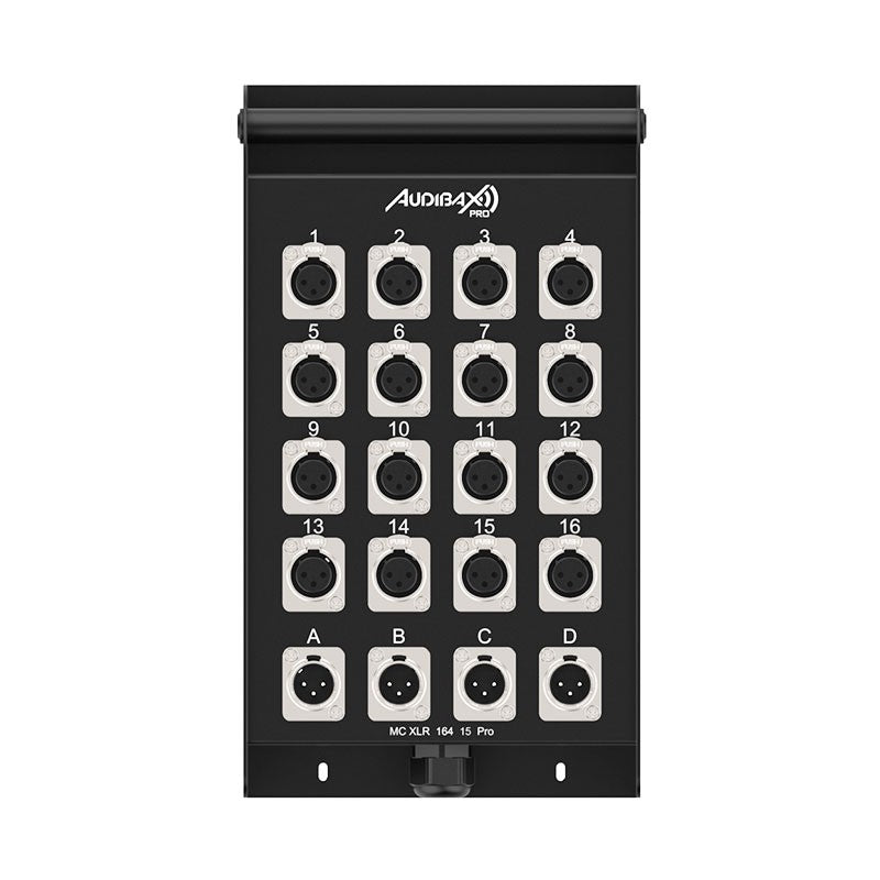 El Audibax Pro MC XLR 16415 Pro es un cajetín de escenario (multicore) diseñado para agilizar el cableado de sonido en vivo, rental e instalación fija. Integra en una caja robusta 16 conectores XLR hembra (entradas) y 4 conectores XLR macho (retornos), unidos a una manguera multipar de 15 metros. Con conductores AWG 26 para señal balanceada y disposición clara de conexiones, ofrece rutas limpias y ordenadas entre escenario y FOH, minimizando errores y tiempos de montaje.
