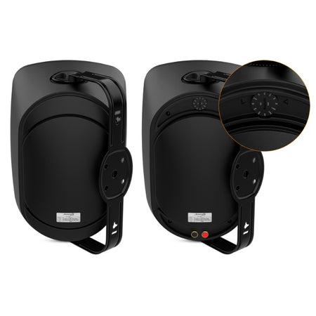 Pareja de altavoces pasivos de pared para exterior IP65, recinto ABS; 8″ LF (cono de grafito) + 1″ HF (cúpula de seda); 57 Hz–20 kHz, 90 dB; funcionamiento en 100V/70V con taps 50/25/12,5/6,25 W (100V) y 20/10/5/2,5 W (70V) o 8 Ω (Euroblock); incluye 2 soportes; dimensiones por unidad 381 × 250 × 250 mm; peso por unidad 5,02 kg; color negro.
