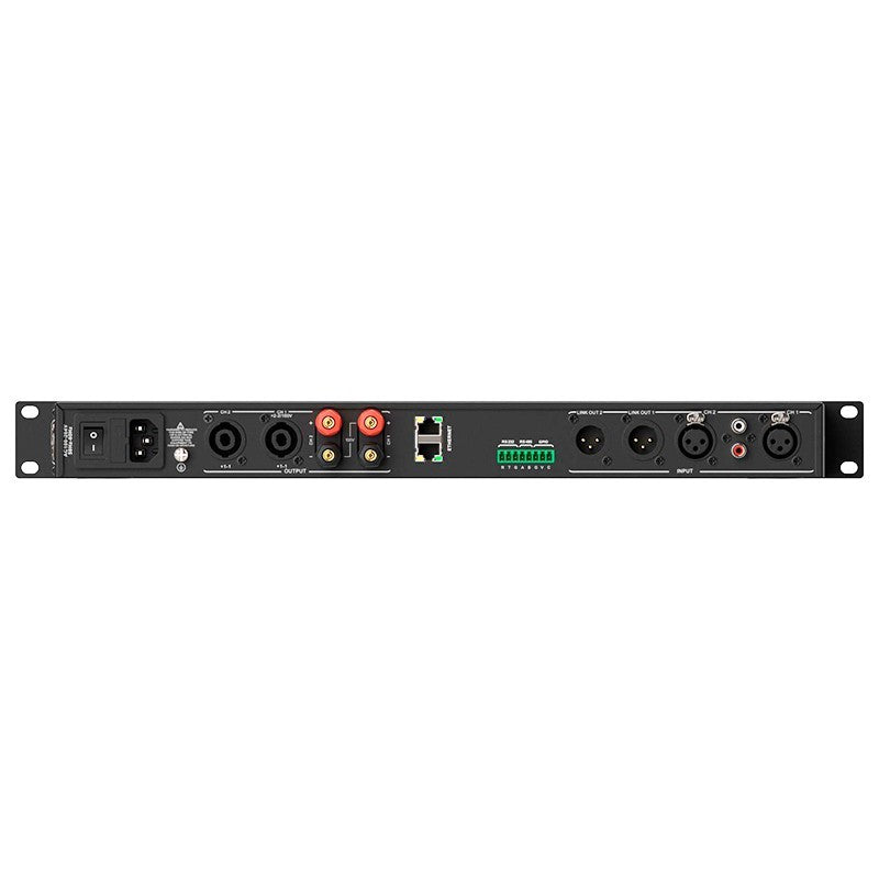 Amplificador de matriz Clase D de 2 canales, 300 W RMS por canal a 8 Ω; operación Low-Z / 70 V / 100 V; bridge 600 W (LoZ/100 V); Dante integrado; DSP con control por Ethernet/USB/RS-232/RS-485; THD+N <0,01 %, diafonía −70 dB, SNR >94 dB; conectividad de línea Euroblock + XLR + Dante; salidas de altavoz Speakon + Terminal; formato rack 19″, 1U; 483 × 300 × 44,5 mm; 3,2 kg; IP20; alimentación AC 180–264 V, 50–60 Hz; color negro.