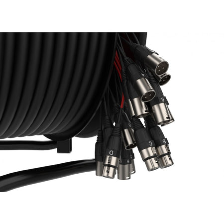 Reel multicore de 30 m con carrete; panel (drum): 16 × XLR H + 8 × XLR M; fan-out: 16 × XLR M + 4 × XLR H; conductores por vía 7 × 0,15 mm (≈ 25 AWG), OFC y cobre estañado; color negro; dimensiones de embalaje 390 × 285 × 500 mm; peso aprox. 21 kg.