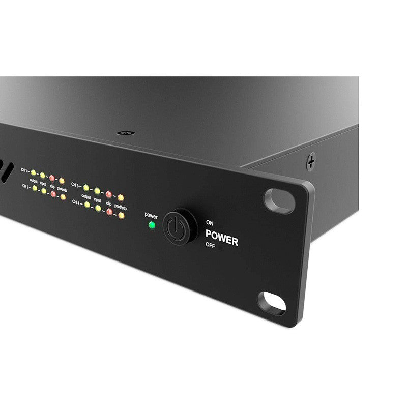 Amplificador de instalación Clase D de 4 canales en rack 19″/1U; operación Low-Z (4–16 Ω) y 70/100 V; potencia nominal 4×500 W y referencia a 8 Ω: 4×350 W; entradas balanceadas Euroblock (4 canales) con ganancia por canal y filtro paso alto por DIP; protecciones (cortocircuito, sobrecarga, temperatura, clip y DC), limitador y pico; auto-standby; salidas a Euroblock con tornillo; alimentación AC 100–240 V, 50–60 Hz; dimensiones 484 × 420 × 44 mm; peso 9,8 kg.