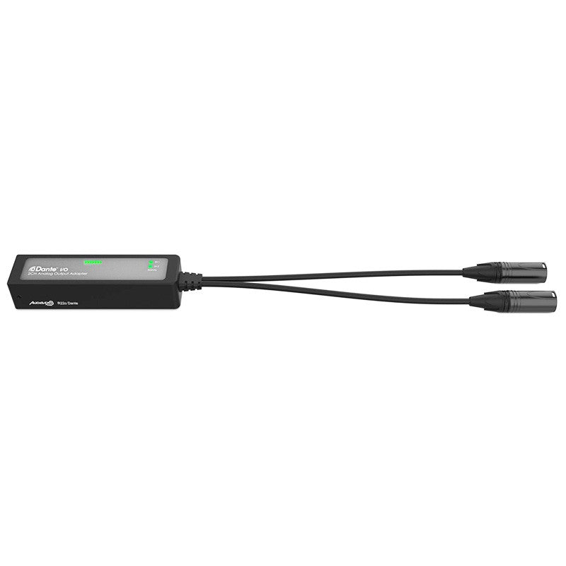 Adaptador Dante de 2 canales con salida analógica balanceada 2×XLR-M; 24 bits; muestreo 44,1/48/96 kHz; SNR 116 dB; THD+N 0,001 % (1 kHz, +4 dBu); respuesta 20 Hz–20 kHz (±0,1 dB); nivel máximo +18 dBu; retardo del dispositivo <1 ms; puerto RJ45 Dante; alimentación PoE 802.3af clase 1; compatible con AES67.