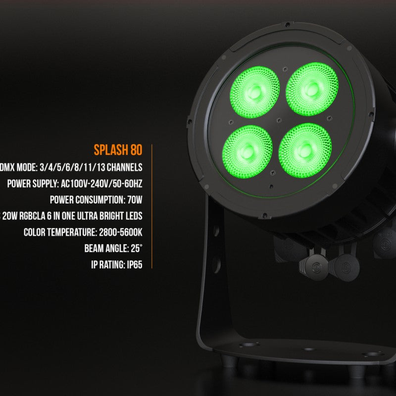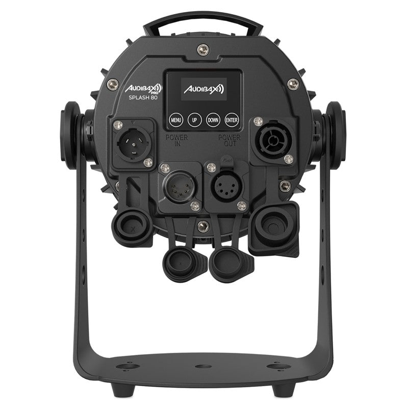PAR LED profesional IP65 Audibax Pro Splash 80: 4 × 20 W RGBALC 6-en-1; óptica 25° (de serie); CRI > 93; CCT 2.800–5.600 K; control DMX/RDM con perfiles 3/4/5/6/8/11/13 ch; dimmer 0–100 %, 4 curvas y respuesta rápida/estándar/tungsteno; PWM 600 Hz–25 kHz; estrobo 1–20 Hz; conectores sellados REAN IP65 PowerCON True In/Out y XLR 5 pines IP65; carcasa de aluminio fundido; refrigeración por convección; 265 × 206 × 144,5 mm (L × An × Al); 2,6 kg.