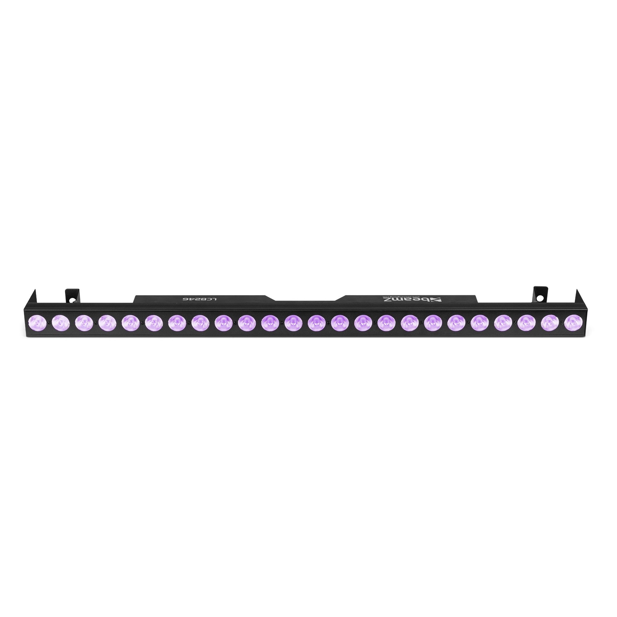 La beamZ LCB246 es una barra LED profesional de 1 metro equipada con 24 LED 6-en-1 de 6 W (RGBAW-UV) organizados en 8 secciones de 3 LED controlables por separado. Gracias a su óptica de 11° de haz y 24° de campo, ofrece lavados uniformes y efectos de pixel mapping precisos, con una emitancia luminosa de 7.613 lx a 1 m. Incorpora 54 shows preprogramados con modos automático y por sonido, además de macros de color y control manual completo.