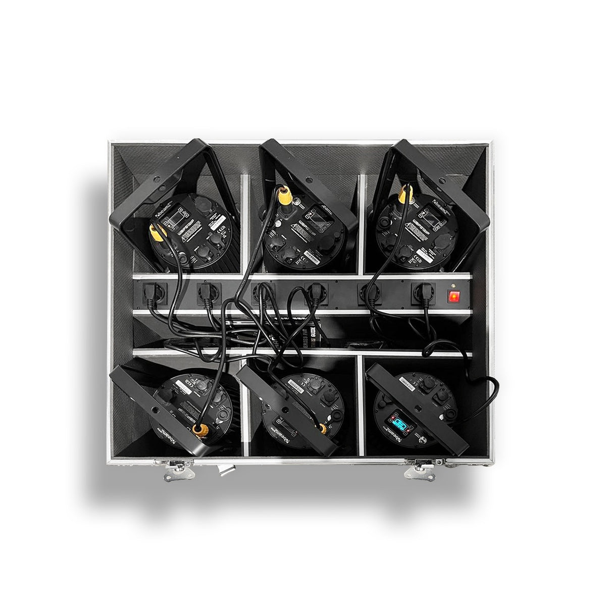 - Ahorro de tiempo en el montaje y desmontaje: las luminarias se cargan dentro del propio flightcase, evitando tener que conectar cada foco a un cargador individual.