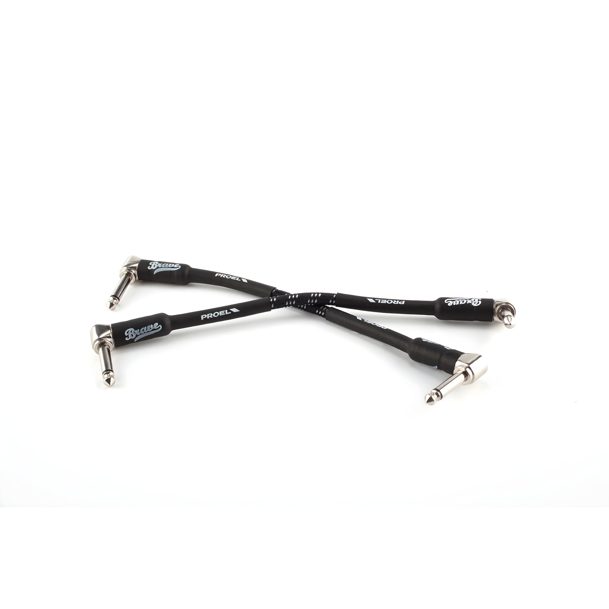 Juego de dos cables de parcheo de instrumento profesional serie Brave. Longitud de 0.15 metros por cable. Construcción compuesta por conductor de Cobre Libre de Oxígeno (OFC) y doble apantallamiento mediante capa de PVC conductivo y espiral de cobre denso. Cubierta exterior de PVC flexible con revestimiento adicional de algodón trenzado color negro/blanco. Diámetro total del cable de 7.0 mm. Terminación en ambos extremos con conectores Jack 6.3 mm Mono (TS) acodados a 90 grados de la marca Proel, con refuerzo termorretráctil en la unión. Impedancia y capacitancia optimizadas para señales de audio desbalanceadas de instrumento.