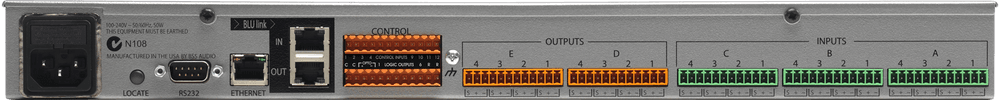 Cada entrada ofrece ganancia por software de 0 a +48 dB en pasos de 6 dB y phantom 48 V conmutable por canal. El frontal muestra, sin necesidad de PC, LEDs de señal, clip y phantom por canal; además incluye indicadores de estado (COM/STAT/ERR/PWR) y función Locate bidireccional para identificar el equipo desde el panel o desde el software. Para integración con sistemas externos, el BLU-101 incorpora 12 entradas de control (GPI) y 6 salidas lógicas (GPO), además de RS-232 y puerto Ethernet de control.