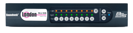 El BSS BLU-BIB (Break-In Box) es un expansor de entradas para la plataforma Soundweb London que añade 8 canales de audio analógico (mic/línea) al bus digital BLU link. Su diseño de media anchura de rack y el uso de Cat 5e permiten desplegar entradas cerca de la fuente y transportar el audio digital a la matriz o procesador sin pérdidas ni latencias apreciables, con tramos de hasta 100 m entre dispositivos y un anillo de hasta 60 nodos. La selección de rango de 8 canales dentro de los 256 canales del bus se realiza mediante interruptores DIP traseros; la unidad no requiere programación en Audio Architect, de modo que la puesta en marcha es muy rápida.