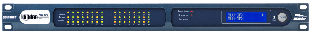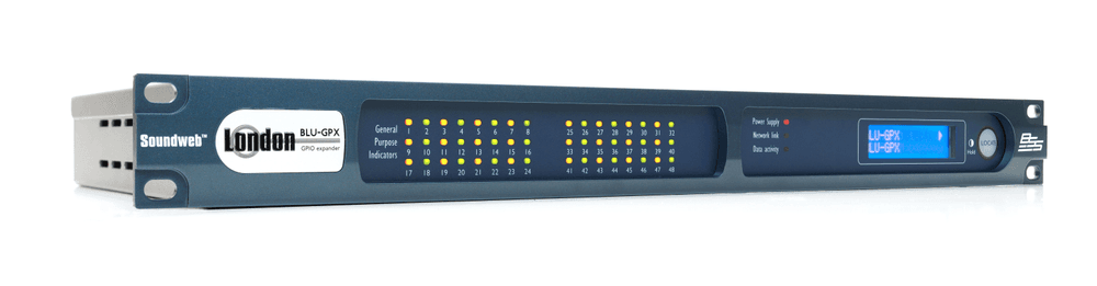 El BSS BLU-GPX es un expansor de GPIO en red para la plataforma Soundweb London que añade, de forma rentable, entradas de control (GPI), salidas lógicas (GPO) y salidas de relé a instalaciones que necesitan más capacidad de control e interfaz analógica. Integra la misma paleta de Objetos Lógicos que el resto de dispositivos de la familia y ofrece dos puertos Ethernet con PoE para comunicaciones, control, monitorización y alimentación primaria, además de alimentación secundaria de 12 V CC para respaldo. Incorpora RS-232, función Locate bidireccional y es conforme a EN 54-16 para aplicaciones de seguridad humana.