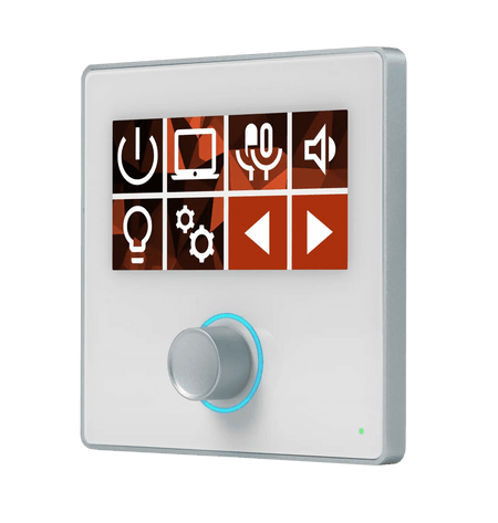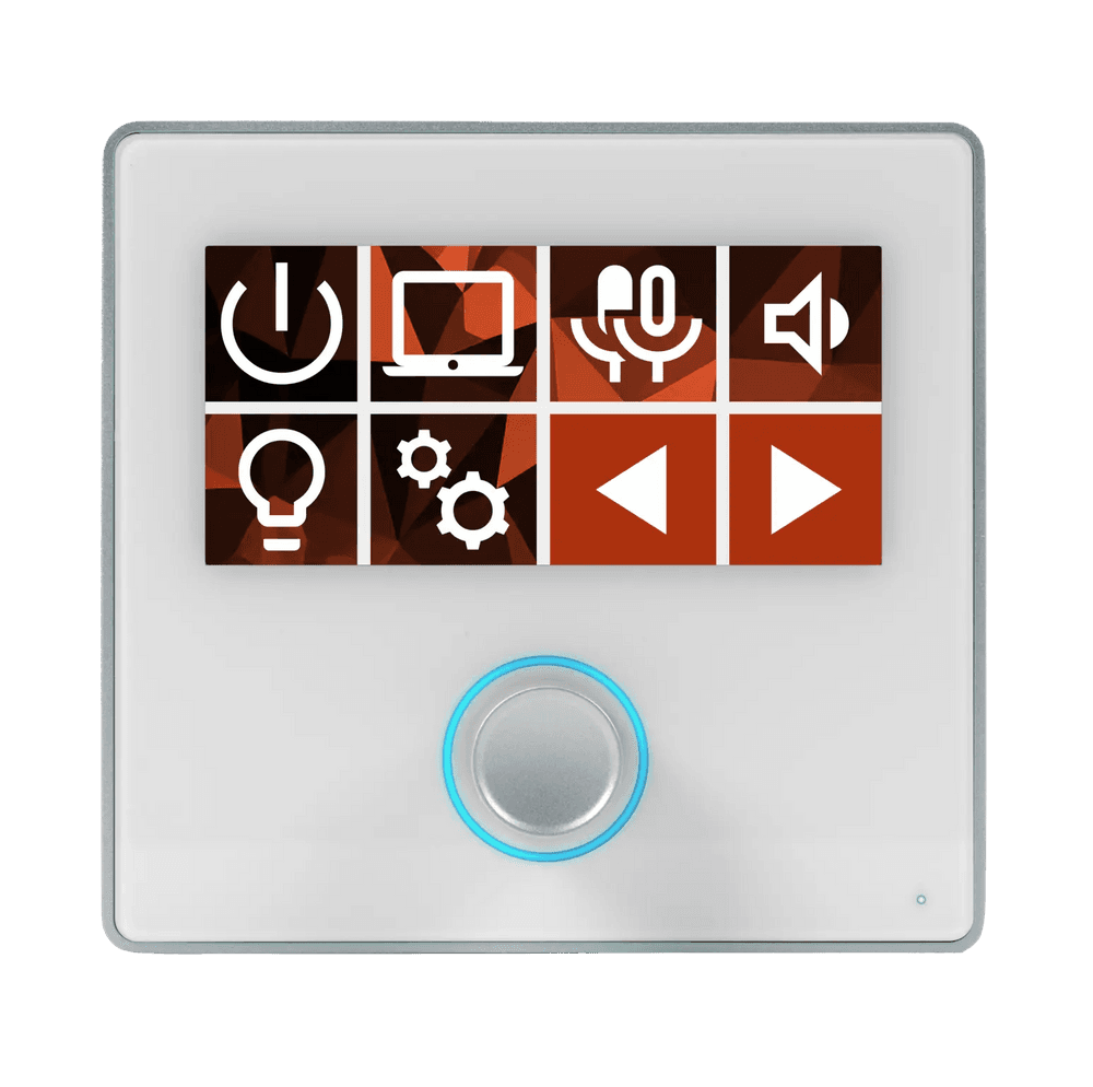 El dispositivo se completa con una perilla rotatoria (encoder) de alta precisión rodeada por un anillo LED de retroalimentación visual. Este control es fundamental para ajustes finos como niveles de volumen, intensidad de iluminación o selección de parámetros, proporcionando una respuesta inmediata e intuitiva que las pantallas táctiles a menudo no pueden replicar con la misma satisfacción ergonómica.