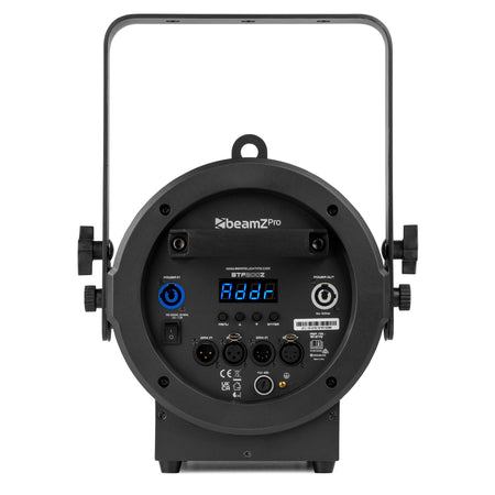 En cuanto a conectividad, el BTF200Z incorpora entrada y salida PowerCON (P-Con) para encadenado de alimentación, así como conexiones DMX de 3 y 5 pines, adaptándose tanto a instalaciones nuevas como a parques de iluminación ya existentes. Se puede controlar mediante DMX en varios modos de canal (2, 3, 4 o 5) o de forma manual desde su display LED, lo que facilita su uso tanto en instalaciones fijas como en alquiler.