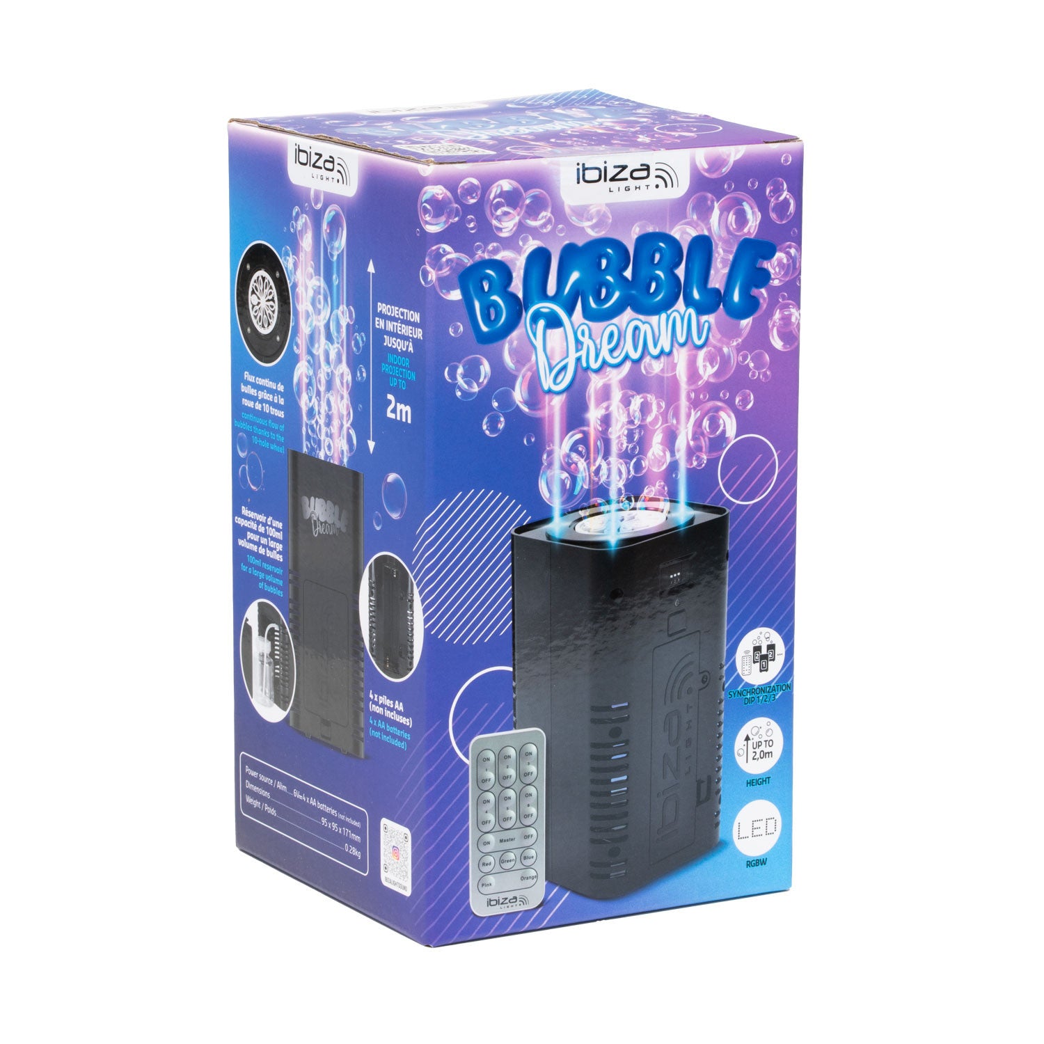 Máquina portátil de burbujas con rueda giratoria; producción de pompas hasta 2,5 m de altura; 4 LEDs RGB integrados; autonomía con 4 pilas AA; mando a distancia; switches DIP para redes de hasta 16 unidades; depósito 100 ml; dimensiones 95 × 95 × 171 mm; peso 0,38 kg.