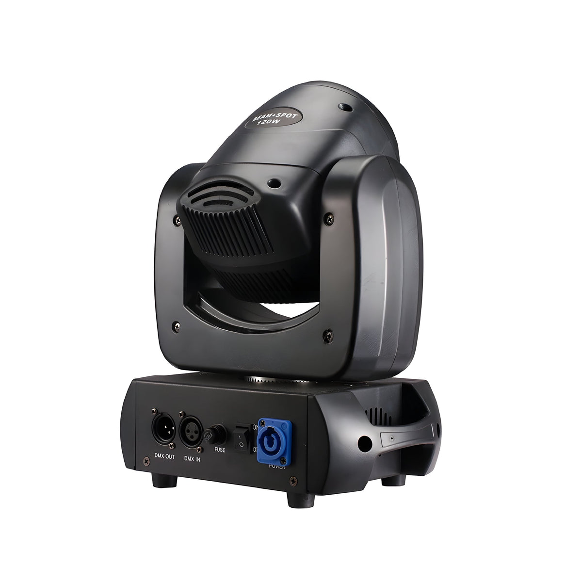 Cabeza móvil Mini Beam & Spot LED 120W, prisma rotativo de ocho caras, rueda de ocho colores, ocho gobos, pan 540°/tilt 180°, DMX512 12 CH, estrobo 25 Hz, dimmer 0–100 %, 27×23×16 cm, 4,8 kg.