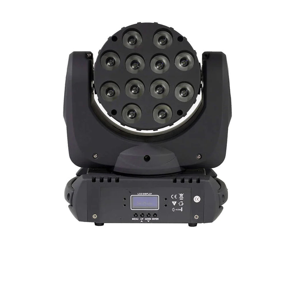 Cabeza móvil Beam LED 12×12 W RGBW, haz 5°, pan 540°/tilt 240° 16 bits, DMX512 (9/16 CH), Auto Run, Sound-to-Light, estrobo, dimmer 0–100 %, macros, AC 110–240 V 50/60 Hz, consumo 150 W, 26×15×30 cm, 5,23 kg, IP20.