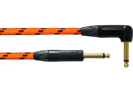 Cable de instrumento profesional de 3 metros de longitud. Equipado con un conector jack de 6.3 mm recto y un conector jack de 6.3 mm acodado, ambos marca Neutrik. Utiliza cable interno Cordial CGK 150 con un conductor central de cobre de 0.50 mm² (AWG 21), compuesto por 28 hilos de 0.15 mm. Presenta una baja capacitancia de 88 pF/m. Incorpora un sistema de doble apantallamiento que consta de un blindaje de cobre trenzado sobre una capa de plástico conductor para minimizar interferencias y microfonía. El diámetro exterior total es de 6.2 mm. El revestimiento exterior es de material textil en color naranja neón con propiedades reactivas a la luz ultravioleta.