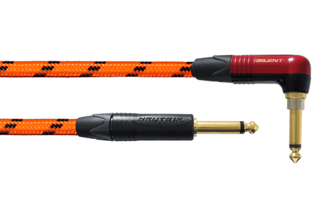 Cable de instrumento profesional de 6 metros de longitud. Conductor coaxial de cobre libre de oxígeno (OFC) con una sección de 0.50 mm² (AWG 21) y una composición de 28x0.15 mm. Presenta una baja capacitancia de 88 pF/m y una resistencia de conductor inferior a 39 Ω/km. Dispone de un sistema de doble blindaje que consiste en una pantalla de cobre trenzado sobre una capa de plástico conductor para minimizar la microfonía y el ruido. La cubierta exterior es de PVC con un revestimiento adicional de tejido textil PET de color naranja reactivo a la luz UV. El diámetro total del cable es de 7.0 mm. Está terminado con un conector jack mono acodado de 6.35 mm Neutrik silentPLUG y un conector jack mono recto de 6.35 mm Neutrik, ambos con contactos chapados en oro.