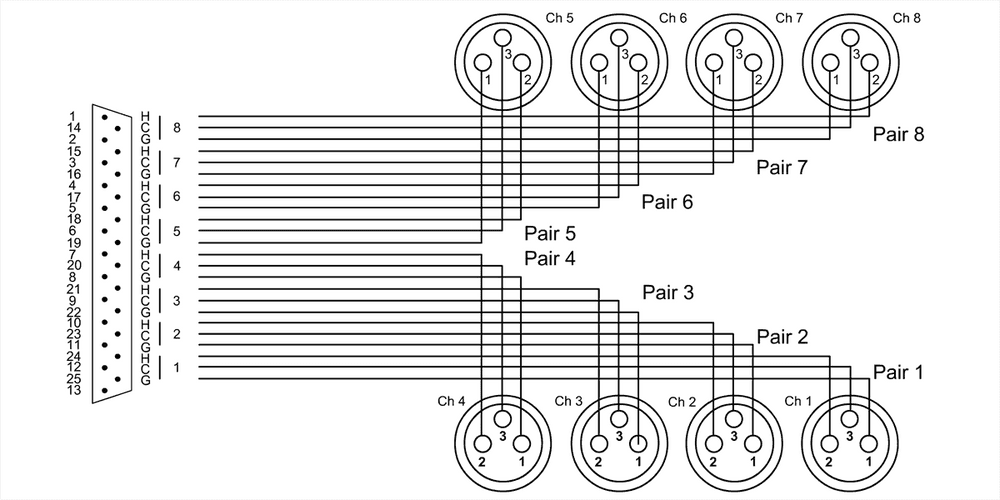 - Conectores de Alta Calidad: Equipado con un conector D-Sub de 25 pines hembra y 8 conectores XLR de 3 pines, asegurando conexiones seguras y duraderas.