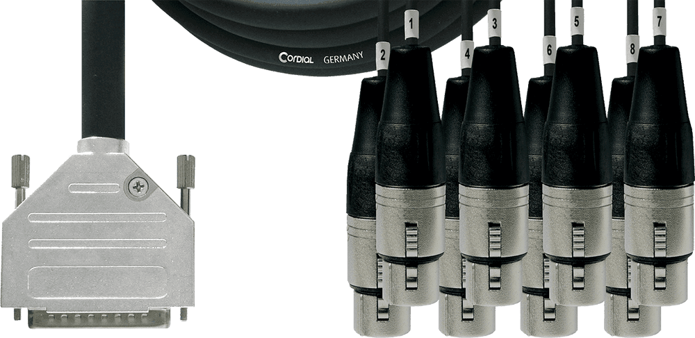 Cable de audio multicanal tipo manguera de 1.5 metros de longitud. Dispone de un conector hembra D-Sub de 25 pines en un extremo y una división a 8 conectores XLR de 3 pines en el otro. Diseñado para la transmisión de 8 canales de audio analógico balanceado. El pinout del conector D-Sub es compatible con el estándar TASCAM DA-88. Cableado interno con apantallamiento para protección contra interferencias electromagnéticas y cubierta exterior de PVC resistente.
