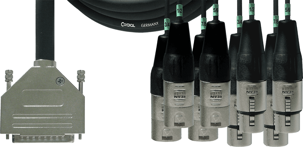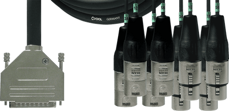 Cable de interfaz multicore de 3 metros de longitud con conector D-Sub 25 pines macho a un breakout de 4 conectores XLR macho de 3 pines y 4 conectores XLR hembra de 3 pines. Basado en el cable Cordial CMD 8, cuenta con 8 pares trenzados de conductores de cobre estañado (sección 0.14 mm²). Incorpora un sistema de doble apantallamiento, con un escudo individual en espiral de cobre estañado para cada par y un escudo trenzado global también de cobre estañado. La impedancia característica es de 110 ohmios, cumpliendo con el estándar AES/EBU. El revestimiento exterior es de PVC negro con un diámetro total de 12,5 mm. Los conectores XLR presentan una carcasa metálica niquelada y la configuración de pines del D-Sub es compatible con el estándar Yamaha.