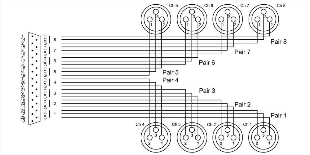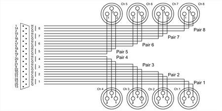 - Conectividad Profesional: Equipado con un conector Sub-D de 25 pines macho en un extremo y ocho conectores XLR hembra de 3 pines en el otro, facilitando la conexión de equipos multicanal.