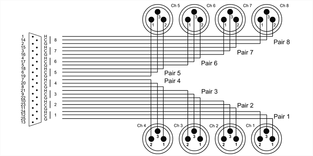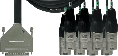 Cable de interfaz multicore de 5 metros con un conector D-Sub de 25 pines macho a 8 conectores XLR macho de 3 pines. La asignación de pines cumple con el estándar analógico Tascam DA-88. Utiliza cable Cordial CMD 8 con 8 pares trenzados y conductores de cobre estañado de 0.14 mm² (AWG 26). Incorpora un blindaje general de malla de cobre estañado y blindaje por par en espiral. Los conectores son REAN Silver niquelados. La cubierta exterior es de PVC con un diámetro de 12.5 mm. Apto para la transmisión de señales de audio analógicas y digitales AES/EBU y DMX.