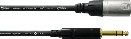 Cable de audio profesional de 9 metros para transmisión de señal mono balanceada. Equipado con un conector XLR macho de 3 pines y un conector jack macho estéreo (TRS) de 6.35 mm. Los conectores son de la marca REAN by Neutrik con contactos niquelados. El cable utilizado es el Cordial CME 220, con una sección de conductor de 2x 0.22 mm² de cobre libre de oxígeno (OFC). Incorpora un blindaje en espiral de cobre para protección contra interferencias y una cubierta exterior de PVC robusta en color negro mate.