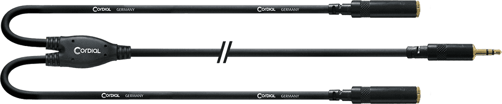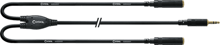Cable adaptador profesional en formato Y, modelo Cordial ECLCFY03WYY. Dispone de un conector minijack estéreo (TRS) macho de 3,5 mm a dos conectores minijack estéreo (TRS) hembra de 3,5 mm. Longitud total de 0,3 metros, con una longitud de división de aproximadamente 15 cm. Los conectores son marca REAN by Neutrik con contactos chapados en oro. La sección del conductor es de 2 x 0.22 mm² con apantallamiento en espiral y cubierta exterior de PVC de color negro.