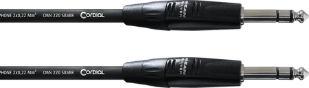 Cable de audio profesional de 3 metros para transmisión de señal estéreo balanceada. Equipado con dos conectores Jack (TRS) de 6.3 mm REAN by Neutrik. Utiliza el cable a granel Cordial "Essentials Cable 1" con una cubierta de PVC. La estructura del conductor es de 0.22 mm² (AWG 24), compuesta por 28 hilos de cobre desnudo de 0.10 mm. Incorpora un apantallamiento en espiral con hilos de cobre desnudo y dos núcleos trenzados para una transmisión de señal óptima.