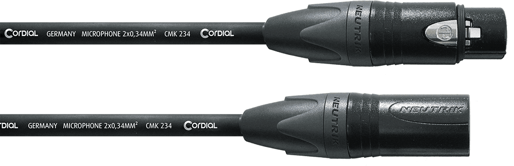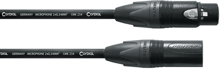 Cable de micrófono balanceado de 10 metros de longitud, modelo Cordial CPM 10 FM 234. Equipado con conectores XLR de 3 pines Neutrik NC3MXX (macho) y NC3FXX (hembra). Utiliza cable interno Cordial CMK 234 con una sección de conductor de 2 x 0,34 mm² (AWG 22), compuesto por 26 hilos de cobre de 0.127 mm por conductor. Dispone de apantallamiento en espiral de cobre y aislamiento de conductores de polietileno (PE). La cubierta exterior es de PVC de alta flexibilidad en color negro, con un diámetro total de 6.2 mm. Resistencia de conductor de 58 Ohm/km y capacidad eléctrica de 60 pF/m.