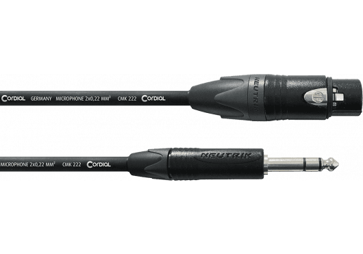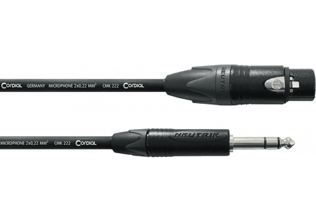 Cable de audio profesional de 10 metros de longitud para transmisión de señal balanceada. Equipado con un conector XLR hembra de 3 pines y un conector Jack TRS de 6.3 mm. Utiliza conectores marca NEUTRIK® con contactos plateados. El cable interno es el modelo Cordial CMK 222, con dos conductores de cobre trenzados y una sección de conductor de 0.22 mm². La cubierta exterior es de PVC de color negro, proporcionando durabilidad y flexibilidad.