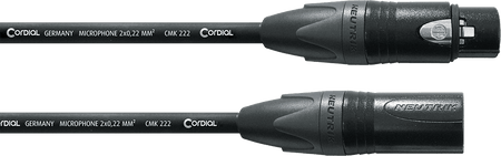 Cable de micrófono balanceado de 20 metros de longitud. Utiliza cable Cordial CMK 222 con una sección de conductor de 2x 0.22 mm² (AWG 24) compuesto por 28 hilos de cobre desnudo de 0.10 mm cada uno. Dispone de un blindaje en espiral de cobre para una máxima protección contra interferencias. Está terminado con conectores XLR de 3 pines (hembra-macho) de la marca Neutrik con contactos plateados. La cubierta exterior es de PVC resistente con un diámetro total de 6.4 mm. Presenta una resistencia de conductor de 85 ohmios/km y una capacitancia de 55 pF/m.