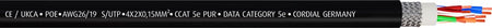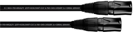 Cable de red para transmisión de datos, con una longitud total de 0,5 metros y categoría Cat5e. Está construido con el cable Cordial CCAT 5, que presenta una cubierta exterior de poliuretano (PUR) de color negro, libre de halógenos. Los conductores internos son de cobre, con una estructura AWG 26/7. El cable cuenta con un apantallamiento global S/UTP. En ambos extremos está terminado con conectores Neutrik NE8MC Ethercon, que alojan un conector RJ45 en una carcasa metálica con mecanismo de bloqueo. El diámetro exterior del cable es de 6,4 mm y su impedancia característica es de 100 ohmios.
