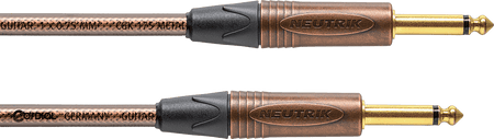 Cable de instrumento profesional de 6 metros de longitud. Equipado con dos conectores jack mono de 6.3 mm (TS) Neutrik® NP2X con contactos bañados en oro. Utiliza cable a granel Cordial CGK 175 con un conductor de cobre libre de oxígeno (OFC) de 0.75 mm² (AWG 19), compuesto por 42 hilos de 0.15 mm. Presenta un doble apantallamiento mediante un blindaje de cobre trenzado y una capa de plástico conductor. La capacitancia es de 88 pF/m y la resistencia del conductor es inferior a 25.5 Ω/km. El diámetro exterior del cable es de 7.2 mm, con una cubierta de PVC robusta y semitransparente.
