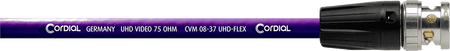 Cable de vídeo profesional de 30 cm para transmisión de señales UHD/4K. Compuesto por cable coaxial flexible Cordial CVM 08-37 UHD-FLEX con una impedancia de 75 ohmios y una sección de conductor de 0.38 mm². Incorpora un doble blindaje de malla de cobre trenzada. Terminado en ambos extremos con conectores BNC Neutrik rearTWIST modelo NBNC75BJP9X. Apto para señales 12G-SDI, 6G-SDI, 3G-SDI y HD-SDI.