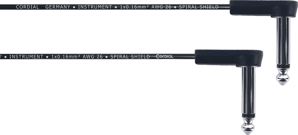 Latiguillo de interconexión para instrumentos con una longitud de 10 cm. Dispone de dos conectores jack mono de 6.3 mm acodados tipo "pancake". El cable presenta un diseño plano con un revestimiento de PVC. La sección del conductor es de 0.16 mm², y cuenta con un doble apantallamiento compuesto por un blindaje de cobre en espiral y una capa de plástico conductivo para una transmisión de señal sin interferencias.