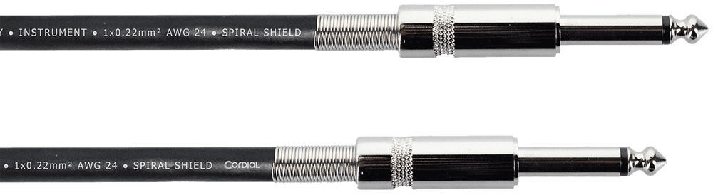 Cable de instrumento de 5 metros con dos conectores jack mono TS de 6.3 mm. Conductor de cobre de 0.22 mm² (AWG 24) de sección, compuesto por 28 hilos de 0.10 mm. Incorpora doble blindaje mediante apantallamiento en espiral de cobre y plástico conductor. La capacitancia es inferior a 85 pF/m y la resistencia del conductor es menor a 90 Ohm/km. El aislamiento del conductor es de polietileno (PE) y la cubierta exterior es de PVC. Los conectores cuentan con contactos niquelados y protección metálica contra dobleces.
