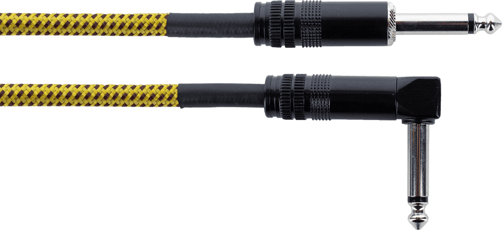 Cable de instrumento de 5 metros de longitud. Dispone de un conector jack TS de 6,3 mm mono recto y un conector jack TS de 6,3 mm mono acodado. Los contactos de los conectores están niquelados. El conductor interno presenta una sección de 0.22 mm² (AWG 24) compuesto por 28 hilos de cobre de 0.10 mm. Cuenta con un doble apantallamiento mediante un blindaje en espiral de cobre y una capa de plástico conductor. El revestimiento exterior es textil (tweed) sobre una cubierta de PVC, con un diámetro total de 6.5 mm.