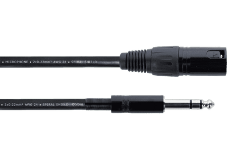 Cable de audio profesional de 1 metro para transmisión de señal balanceada. Incorpora un conector XLR macho de 3 pines y un conector jack estéreo (TRS) de 6.3 mm. El cable tiene un área de conductor de 2 x 0.22 mm² y está construido con 28 hilos de cobre de 0.10 mm por conductor. Presenta un apantallamiento en espiral de cobre con un 95% de cobertura. La cubierta exterior es de PVC con un diámetro total de 6.0 mm. Los conectores son metálicos con contactos niquelados.