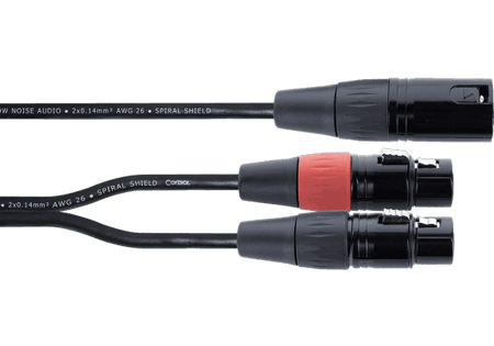 Cable divisor de audio tipo Y con una longitud de 0.3 metros, diseñado para dividir una señal balanceada. Equipado con 1 conector XLR macho de 3 pines a 2 conectores XLR hembra de 3 pines. Incorpora conectores REAN by Neutrik con contactos plateados. El cable posee un área de conductor de 2 x 0.22 mm² (AWG 24) compuesto por 28 hilos de cobre de 0.10 mm. Dispone de un blindaje de cobre en espiral para protección contra interferencias y una cubierta exterior de PVC robusta con un diámetro total de 4.3 mm.