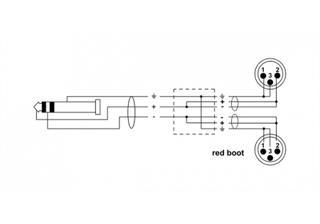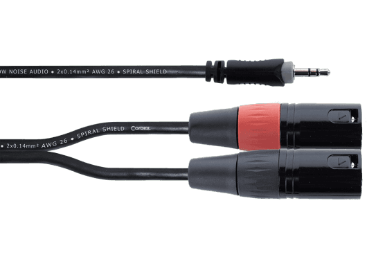 Cable de audio en formato Y con una longitud de 1,5 metros. Dispone de un conector de entrada mini jack (3,5 mm) estéreo y dos conectores de salida XLR macho de 3 pines. Los conductores internos tienen una sección de 0.14 mm² y están protegidos por un blindaje en espiral de cobre desnudo. Los conectores son marca REAN con contactos chapados en oro. La cubierta exterior es de PVC robusto.