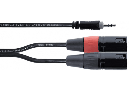 Cable de audio en formato Y con una longitud de 3 metros. Dispone de un conector de entrada mini-jack de 3.5 mm estéreo (TRS) y dos conectores de salida XLR macho de 3 pines. Los conectores son marca REAN by Neutrik. El cable posee un revestimiento exterior de PVC negro y una sección de conductor de 0.22 mm² por canal, diseñado para dividir una señal de audio estéreo en dos salidas mono.