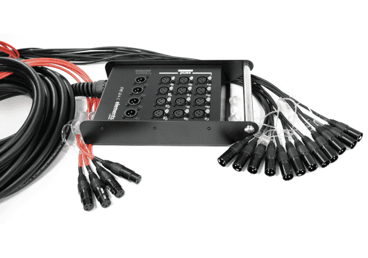 Sistema multicore de audio analógico con caja de escenario y látigo. Configuración de 16 canales: 12 entradas (XLR hembra) y 4 salidas (XLR macho). Longitud del cable principal de 30 metros. Caja de escenario con chasis metálico trapezoidal. Conectores REAN (by Neutrik) soldados a mano. Cable con cubierta exterior de PVC, protección contra torceduras y alivio de tensión en los puntos de conexión. Identificación de canales numerada.