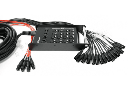 Caja de escenario multicore de 15 metros con 20 canales en total. Configuración de 16 canales de envío (entradas) y 4 canales de retorno (salidas) con conectores XLR. Cajetín con carcasa metálica. Cable con diámetro exterior de 14,5 mm y cubierta de PVC. Conductores de cobre desnudo de 18 x 0,10 mm con un área de sección de 0,14 mm². Cada par de conductores cuenta con apantallamiento individual mediante lámina AL/PT y hilo de drenaje. Resistencia del conductor de 127 Ohm/km y capacidad de 52 pF/m. Aislamiento de conductores de PE.