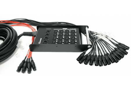 Sistema multicore de audio analógico con una longitud de 30 metros. Configuración de 16 canales de entrada y 4 canales de salida. El sistema consta de un cajetín de escenario metálico de forma trapezoidal y un extremo de cable dividido (splitt). El cajetín está equipado con 16 conectores XLR hembra y 4 conectores XLR macho. El splitt está terminado con 16 conectores XLR macho y 4 conectores XLR hembra. Todos los conectores son de la marca REAN by Neutrik, soldados a mano. El cable cuenta con protección contra torceduras en la unión con el cajetín y en cada conector individual del splitt. Diámetro aproximado del cable: 14.2 mm.